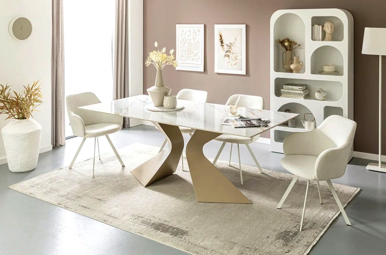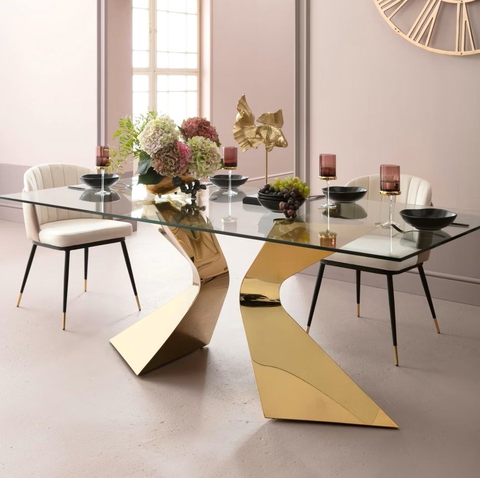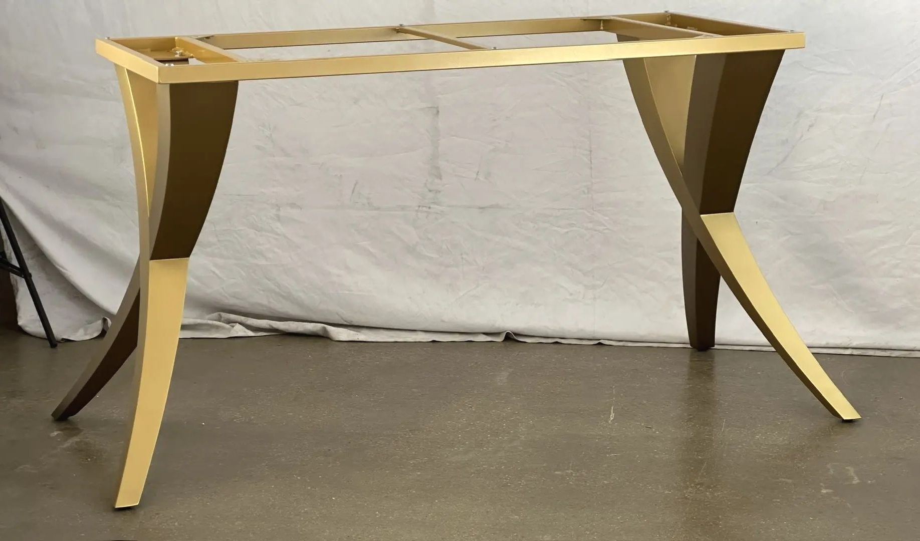 Дизайнерское золотое подстолье для гостиной, кухни, кафе, ресторана, бара, отеля. Подстолье из нержавеющей матовой стали золотого цвета. Подстолье для столешниц из керамогранита, гранита, мрамора, массива, шпона, МДФ, пластика. Подстолье подходит для прямоугольной и овальной столешницы. Высота 73 см, Ширина 140 см, Глубина 65 см, верхняя рамка 120х55 см, вес 15,5 кг. Рекомендуемые размеры столешниц: 140х80, 150х90, 160х90, 180х100, 200х90, 200х100, 210х100, 220х90, 220х100, 240х100, 240х120 см. Подстолье для интерьера в стиле нео барокко, современная классика, Арт Деко, Модерн.