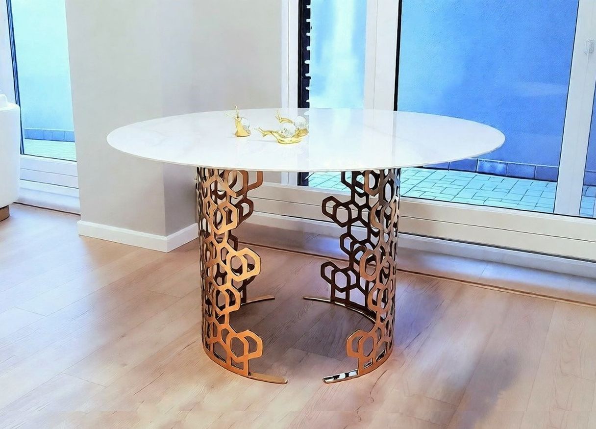 Оригинальное дизайнерское подстолье для гостиной, кухни, кафе, бара, ресторана, отеля. Подстолье комплект из 2х шт подходит для мраморных столешниц, столешниц из керамогранита, шпонированных столешниц. Подстолье из полированной нержавеющей стали с покрытием нитрид титана золотого цвета. Высота 71 см, Ширина полукруга 33 см, Глубина 61 см, вес 21 кг. Рекомендуемый размер столешниц: 140х90, 150х100, 160х100, 180х100, 200х100, 210х100, 220х100, 230х100, 240х100 см. Подстолье является репликой итальянской модели.