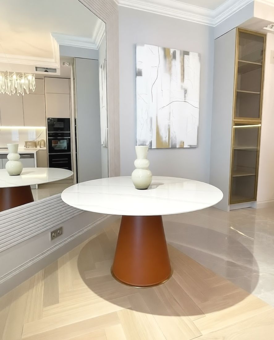 Стильное подстолье золотой конус от дизайнерского стола Yoda для гостиной, кухни, салона, кафе и ресторана. Подстолье из полированной матовой нержавеющей стали с покрытием нитрид титана золотого цвета. Подстолье для мраморного стола, подстолье для столешниц из гранита, кварцевого агломерата, акрилового камня, деревянных столешниц, пластиковых столешниц HPL. Высота 72 см, основание D58 см, вес 26 кг. Рекомендуемый размер столешниц: 80х80, 90х90, 100х100, 110х110, 120х120, 130х130, 140х140, 150х150, D70, D80, D90, D100, D110, D120, D130, D140, D150, D160 см. Подстолье реплика итальянской модели.